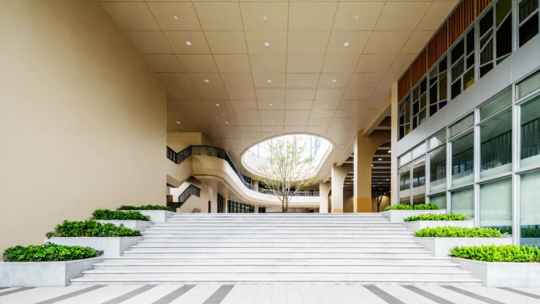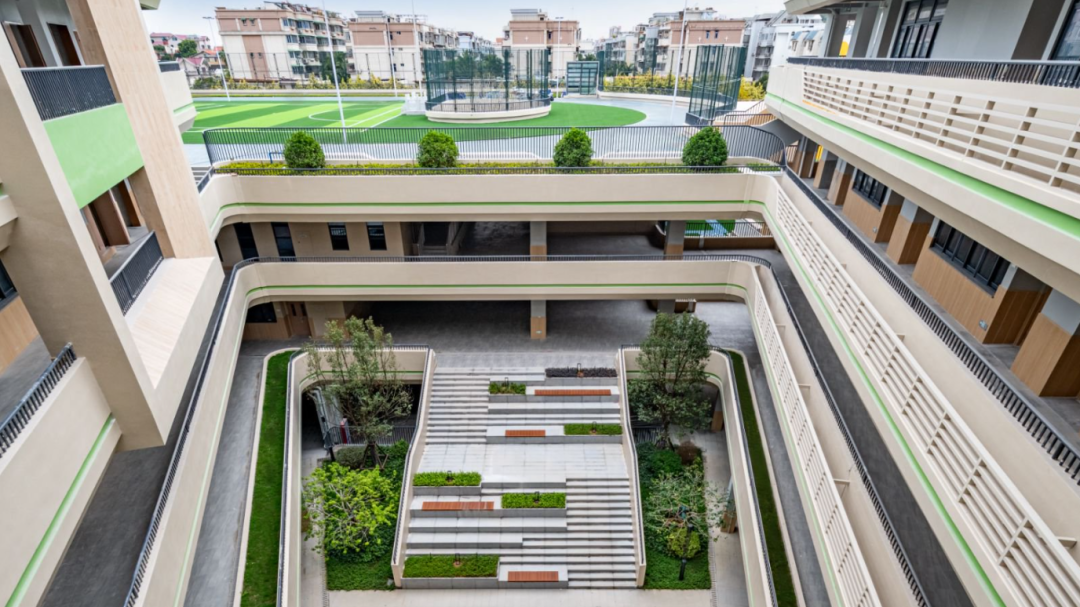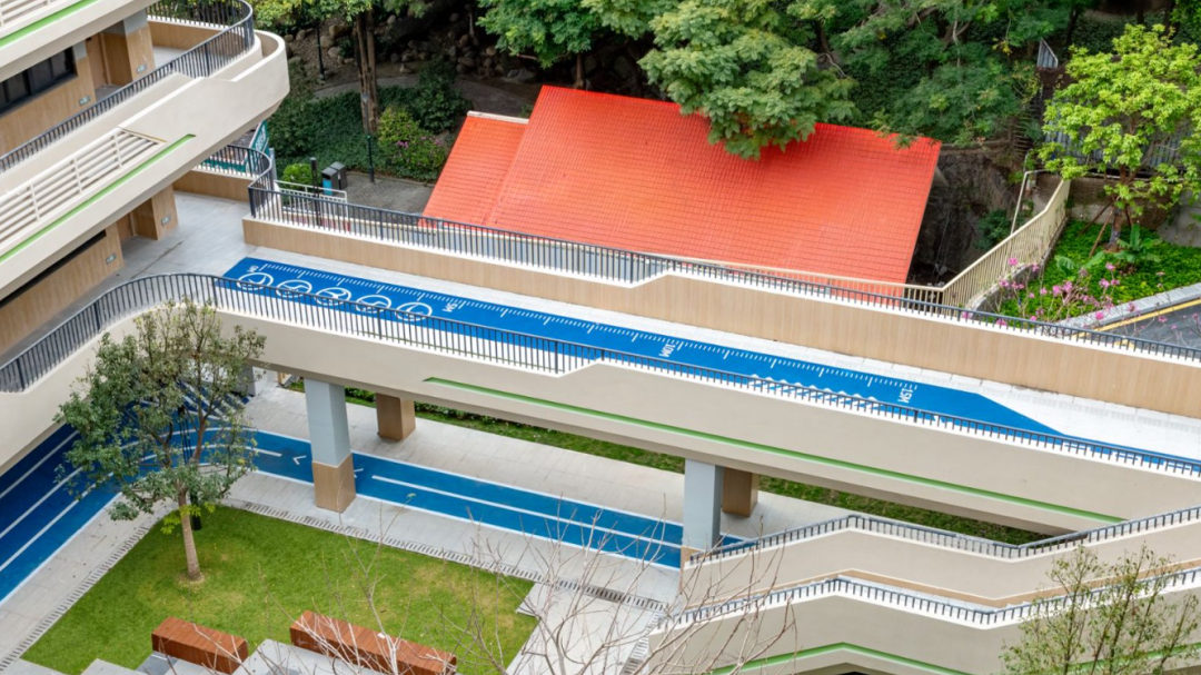 建設(shè)過程中,項(xiàng)目團(tuán)隊(duì)創(chuàng)新采用“垂直生長(zhǎng)、功能疊加”的“3D校園”模式,實(shí)現(xiàn)土地高效利用。校園空間依山就勢(shì),通過建筑扭轉(zhuǎn)與運(yùn)動(dòng)場(chǎng)架空的設(shè)計(jì)手法,將空中跑道、屋頂花園、觀景平臺(tái)串聯(lián),打造與自然融為一體的現(xiàn)代化校園。