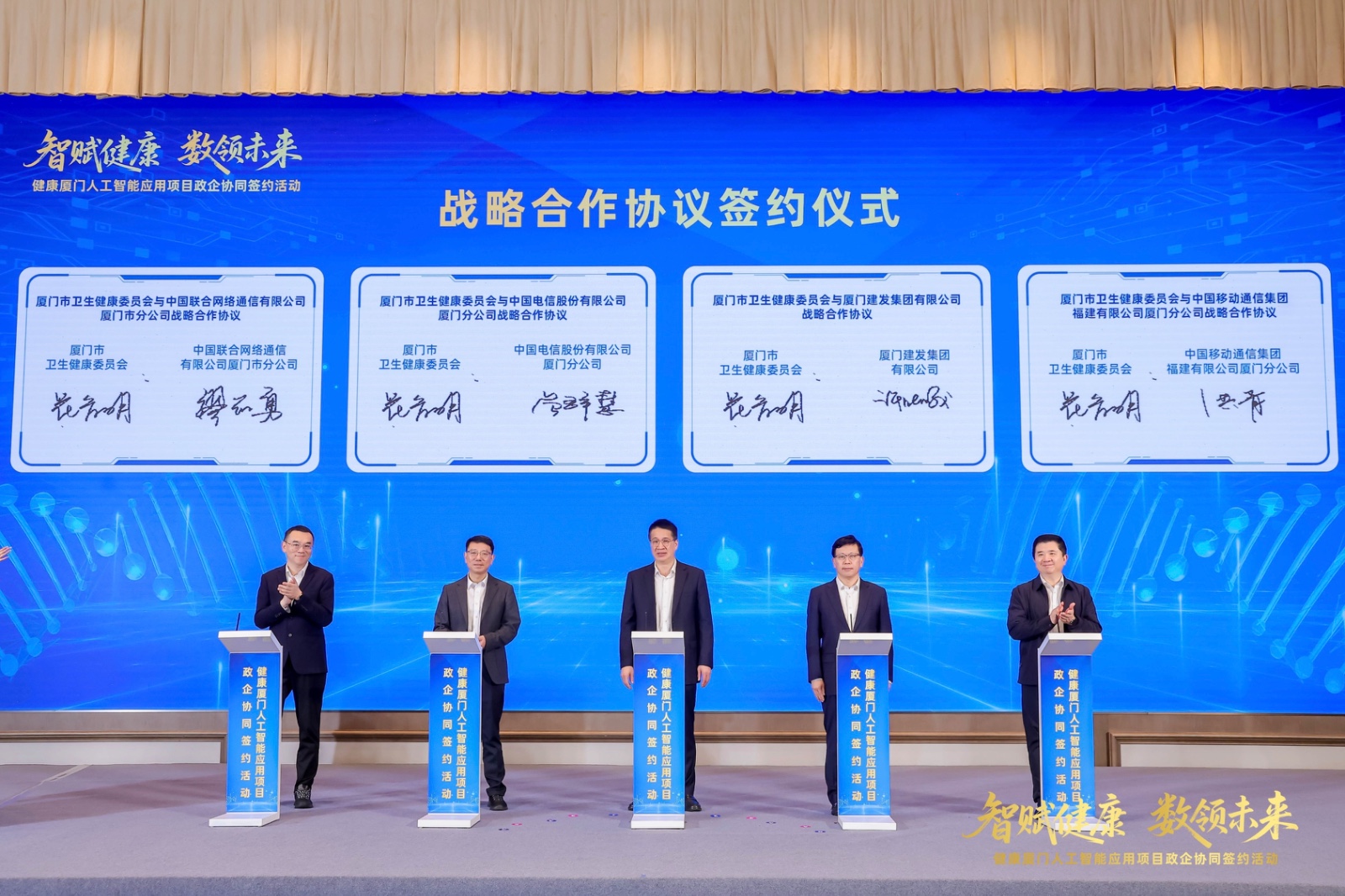 在簽約環(huán)節(jié),市衛(wèi)健委黨組書(shū)記、主任花育明,建發(fā)集團(tuán)黨委書(shū)記、董事長(zhǎng)許曉曦,中國(guó)電信廈門(mén)分公司黨委書(shū)記、總經(jīng)理曾群慧,中國(guó)移動(dòng)廈門(mén)分公司黨委書(shū)記、總經(jīng)理洪青,中國(guó)聯(lián)通廈門(mén)分公司黨委書(shū)記、總經(jīng)理繆志勇共同上臺(tái)簽署政企協(xié)同戰(zhàn)略合作協(xié)議?!八幒淖匪葜腔郾O(jiān)管(一碼通)平臺(tái)”、“區(qū)域影像云一體化服務(wù)平臺(tái)”、“醫(yī)院智慧后勤一體化服務(wù)平臺(tái)”三大人工智能應(yīng)用項(xiàng)目同步上線(xiàn)啟動(dòng)。